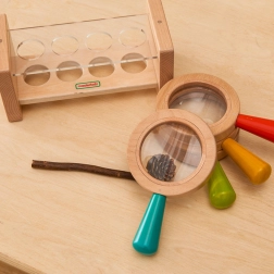 Set je opremljen drvenim stalkom s prozirnim poklopcem koji olakšava pohranu i štiti povećala. Djeca se potiču na znatiželju i učenje kroz igru, što doprinosi razvoju opažačkih vještina.