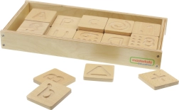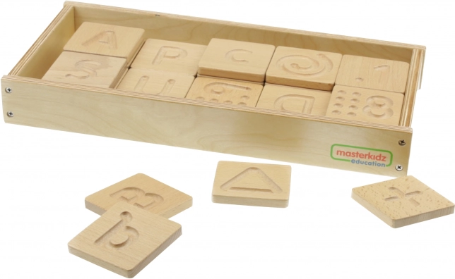 Drveni senzorički set Masterkidz edukativna je igračka koja pomaže djeci razvijati osjet dodira te uvježbavati poznavanje slova, brojeva i oblika.