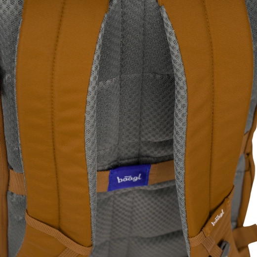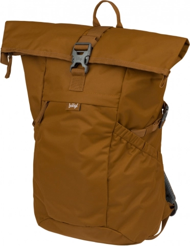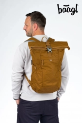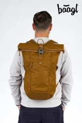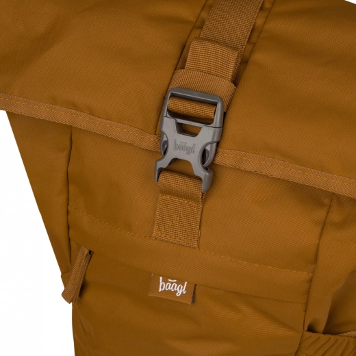 Stilski rolo ruksak BAAGL u karamel boji lagan je, izdržljiv i idealan za grad, školu i izlete. Nudi kapacitet 29 l, nosivost 7 kg, podstavljeni pretinac za prijenosno računalo te brzosušeći vodoodbojni materijal s kvalitetnim patentnim zatvaračima YKK. Ergonomski oblikovana leđa i potporni remeni jamče udobnost i pri duljem nošenju. Certifikacija GRS potvrđuje održivo podrijetlo materijala.