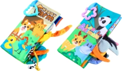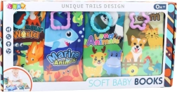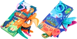 Ove mekane knjige potpuno su sigurne i nježne prema osjetljivoj koži dojenčeta. Svaka knjiga sadrži izdignute elemente i šuškave stranice koje potiču senzorički razvoj djeteta — stimuliraju dodir, sluh i vid. Praktične kopče omogućuju jednostavno pričvršćivanje na dječja kolica ili autosjedalicu. Svaka knjiga ima različitu temu: svijet dinosaura, vodenih životinja, kopnenih životinja i farma, što obogaćuje otkrivanje okolnog svijeta.