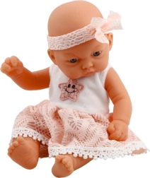 Beba lutka u ružičastoj suknjici s čipkom i odgovarajućom trakom za kosu izuzetno je šarmantan izbor za najmanje entuzijaste koji vole igru kućanstva i oponašanje svakodnevnih aktivnosti odraslih. Njezine zatvorene oči, miran izraz lica i pažljivo izrađena, elegantna odjeća čine da lutka izgleda poput uspavane bebe spremne za zagrljaj, uspavljivanje ili odlazak na spavanje. Njezina nježna mimika daje joj jedinstveni šarm i izaziva prirodne osjećaje brige kod djeteta.