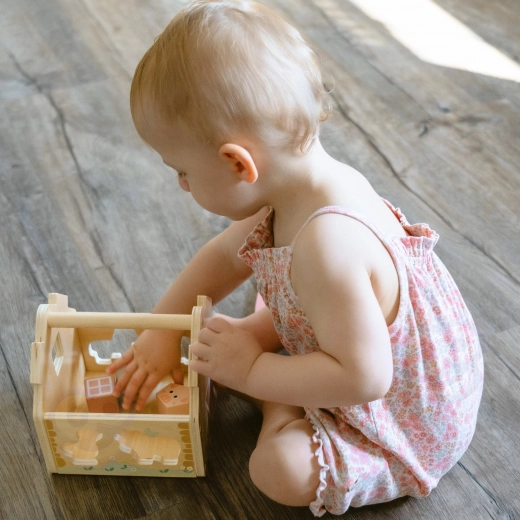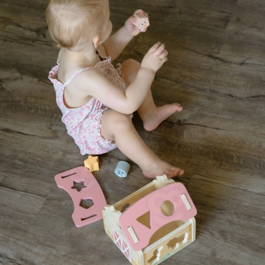 Šarmantna drvena štala s izrezima za životinje i oblike motivira djecu na aktivnu igru i prirodno učenje. Umetanjem pravilnih dijelova djeca vježbaju strpljenje, koncentraciju i razumijevanje uzroka i posljedice. Pastelni, prirodni dizajn odlično se uklapa u dječju sobu.