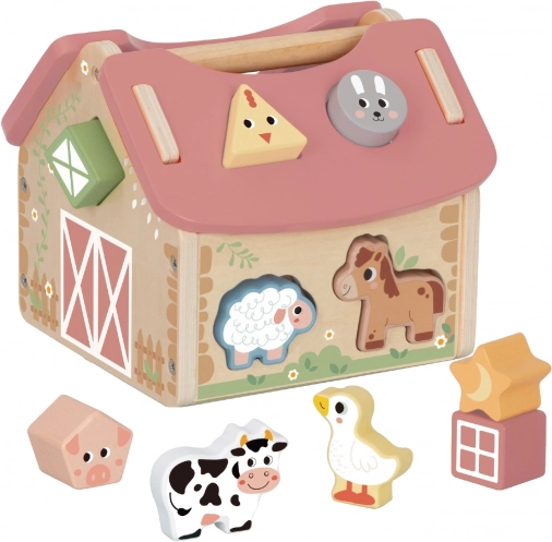 Krov se jednostavno otvara za lako vađenje dijelova i spremanje. Pažljivo obrađeni drveni elementi sa zaobljenim rubovima osiguravaju sigurnu igru. U kompletu su odabrane životinje (kravica, ovčica, konjić, guska) i oblici s tiskom, koji potiču razvoj rječnika i mašte.