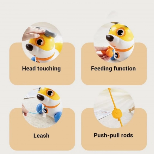 Psić laje i ispušta realistične zvukove, reagira na dodir i nakon „hranjenja“ priloženom košticom pokazuje svoju radost. Uši i rep koji se okreću 360° pojačavaju senzornu stimulaciju, dok elastični držač omogućuje glatko klizanje po podu bez zapinjanja – kod kuće i na tepihu.