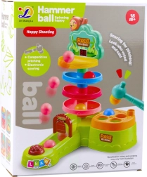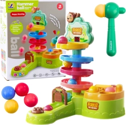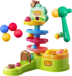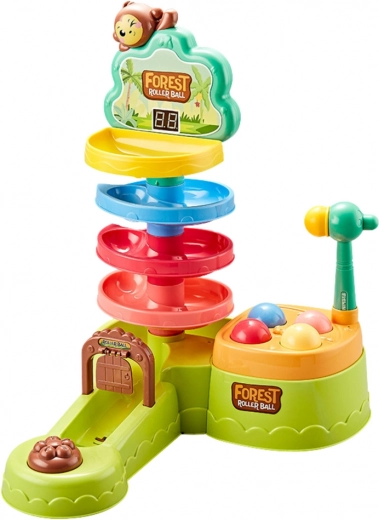 Kuglasta staza izrađena je od sigurnih, šarenih i izdržljivih materijala koji privlače pažnju i potiču na igru. Započnite igru postavljanjem jedne od četiri kuglice na vrh staze. Dijete je pokreće udarcem čekića i promatra kako se spušta, što razvija koordinaciju i razumijevanje uzročno-posljedičnih veza.