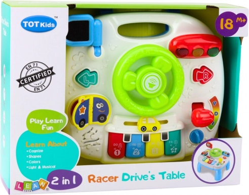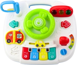 Panel sadrži mnogo pomičnih i interaktivnih elemenata: volan s trubom, svjetlosnu signalizaciju, tipke klavira do-re-mi-fa, okretnu tipku za regulaciju zvuka, knjižicu s slikama vozila, zrcalce, pomičnu ručicu mjenjača, autić i druga šarena dugmad. Pritiskom na tipke dijete čuje zvukove automobila, pjesmice, vesele melodije te se pokreću svjetlosni efekti.