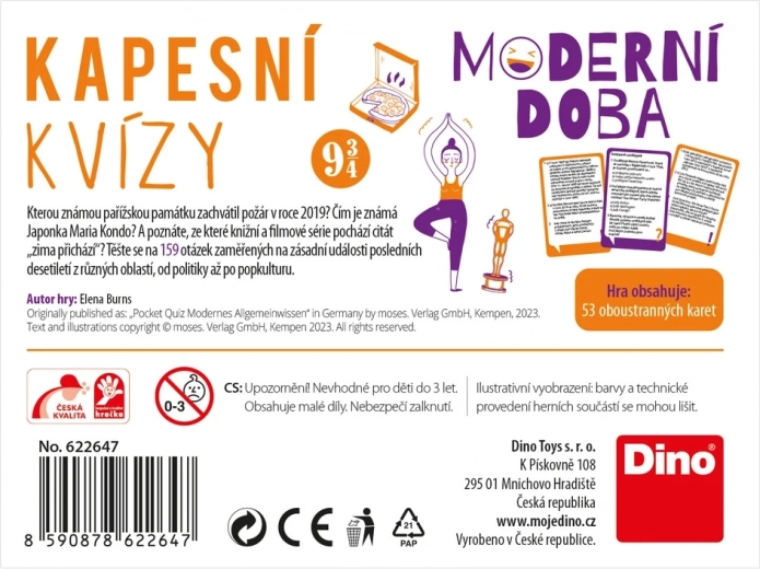Otkrijte zabavnu i pametnu igru za cijelu obitelj: džepne kvizove koji provjeravaju vaše znanje sadašnjosti. Čeka vas 159 pitanja na teme sport, film, kultura, politika, tehnologija i priroda, i to na 53 obostrane kartice s tekstovima na češkom. Idealno za put, za brzu igru i zanimljive činjenice koje će vas iznenaditi.
