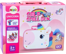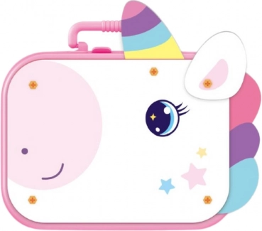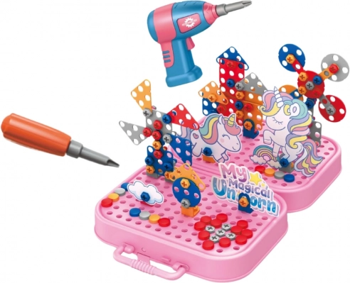 Kreativni set za slaganje u obliku kofera edukativna je igračka koja potiče maštu, razvija manuelne vještine te potiče učenje logičkog razmišljanja i koncentracije. Zahvaljujući priloženoj, sigurnoj baterijskoj bušilici djeca mogu samostalno stvarati razne trodimenzionalne konstrukcije od šarenih vijaka i montažnih elemenata. Ovaj proces zavrtanja i projektiranja razvija preciznost pokreta, strpljenje i ustrajnost. Motiv jednoroga, pastelne boje i estetska, zatvoriva ambalaža čine set vizualno privlačnim i prijateljskim za djecu.