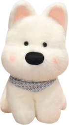 Plišani psić odlikuje se nježno bijelom dlakom i crnim očima, koje mu daju posebno sladak izgled. Ukupan dizajn obogaćen je ukrasnom maramom u plavim tonovima, koja naglašava njegov prijateljski karakter.