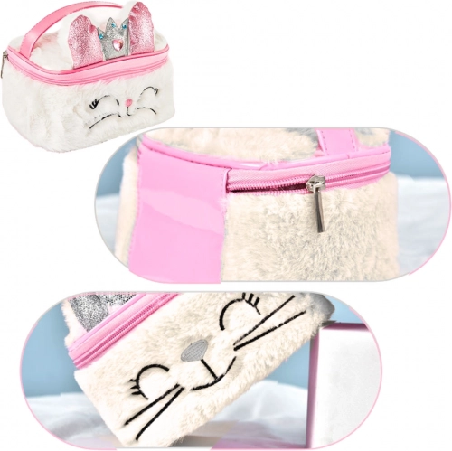 Ova kozmetička torbica izrađena je od kvalitetnog mekog pliša u kombinaciji s sjajnim sintetičkim materijalom. Glavni pretinac sa zatvaračem osigurava lak pristup i sigurno spremanje sadržaja. Torbica je opremljena praktičnom ručkom za nošenje, lagana je, praktična i estetski privlačna – idealna i za svakodnevnu upotrebu i za putovanja.
