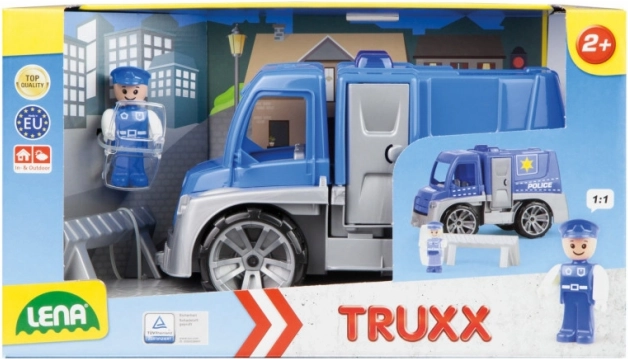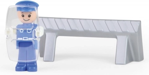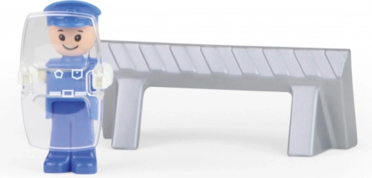Dio kompleta je aktivna figurica policajca sa štitom i prometna barijera, što djeci omogućuje stvaranje vlastitih policijskih scenarija i uvježbavanje uloge pomaganja i zaštite. Igračka je u potpunosti mehanička – bez baterija, samo čista zabava.
