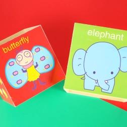 Dijete uči brojeve, kako brojati, osnovne engleske riječi te prepoznavati popularne životinje s farme. Jedna strana kocke prikazuje broj i njegov naziv na engleskom, druga odgovarajući broj životinja. Sljedeća strana sadrži sliku životinje s engleskim natpisom. Tu su i otvori za uklapanje oblika, što je izvrsna vježba preciznosti i koordinacije ruka–oko.