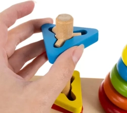 Upoznajte se s tri osnovna oblika: krug, trokut i pravokutnik. Igračka sadrži podlogu i mnoštvo dijelova kojima se može lako rukovati i slagati.