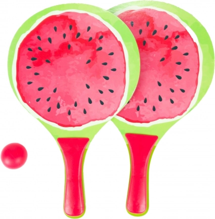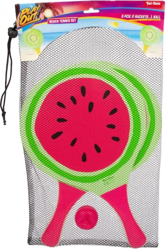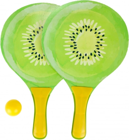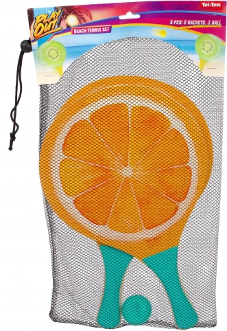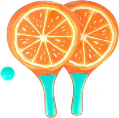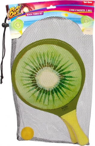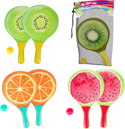Uživajte u ljetu uz stilski set za plažni tenis s voćnim motivima. Sadrži 2 lagana reketa i 1 lopticu u praktičnoj mrežastoj vrećici za nošenje. Šareni otisci kivija, lubenice ili naranče mame na igru na plaži, u vrtu ili parku. Odlično za obiteljsku zabavu, razvoj koordinacije i kretanja na svježem zraku.