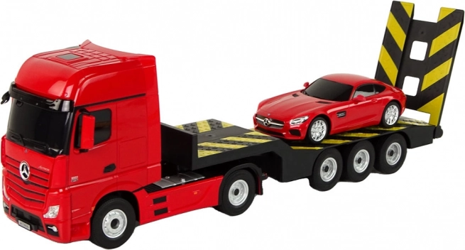 Vozilo ima dimenzije 64 cm x 16 cm x 10 cm, što omogućuje prijevoz drugih igračaka. Crveni Mercedes autić, dio seta, u potpunosti je upravljiv daljinski i njegovi su dimenzije 18 cm x 5 cm x 8 cm, idealni za dječje ruke. Svi dijelovi, uključujući upravljač dimenzija 13 cm x 6 cm x 10 cm, izrađeni su od izdržljive plastike, što jamči dugotrajnu zabavu.