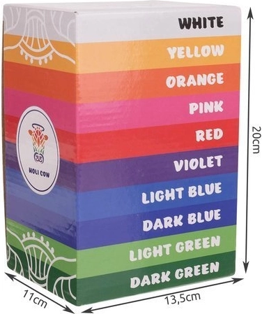 Doživite atmosferu festivala boja s kompletnim setom od 10 izražajnih nijansi. HOLI obojeni prah izrađen je od kukuruznog škroba s kvalitetnim bojilima, zbog čega je lagan, lijepo leprša i stvara fotogenične efekte pri bacanju u zrak i na grupnim događanjima.