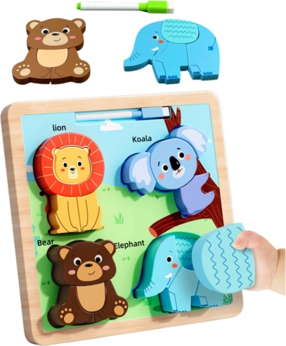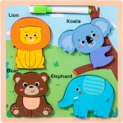 Drvena edukativna slagalica s motivom divljih životinja univerzalna je igračka koja razvija djetetove manualne i kognitivne vještine. Ova slagalica sadrži četiri šarene figure divljih životinja: lava, koalu, medvjeda i slona, koje se mogu smjestiti na odgovarajuća mjesta.