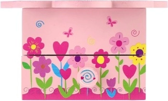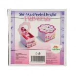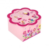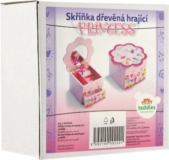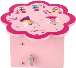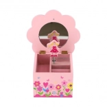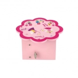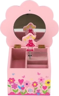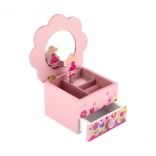 Očaravajuća drvena kutija za nakit u ružičastoj boji razveselit će svaku malu ljubiteljicu bajki. Poklopac u obliku cvijeta skriva ogledalce, a nakon otvaranja pokreće se glazbeni mehanizam koji svaki trenutak ukrašavanja pretvara u čarobni ritual. Unutarnja organizacija s pretincima i donja ladica pomažu održati red u prstenju, narukvicama, perlicama i sitnim dragocjenostima.