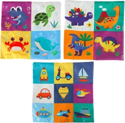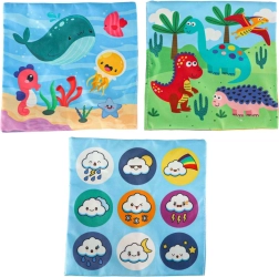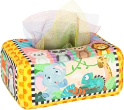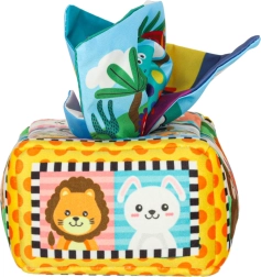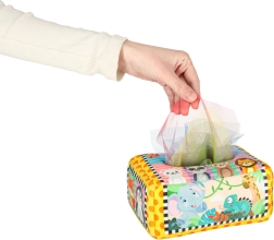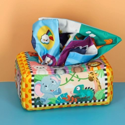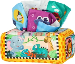- Senzorička stimulacija: Set uključuje 8 prozirnih šarenih maramica i 3 tkanine s različitim uzorcima, koje stimuliraju vid i dodir djeteta, razvijaju senzoričku percepciju. Plišasta kutija i tri maramice s uzorcima opremljeni su folijom koja proizvodi zvuk koji potiče znatiželju i podržava razvoj sluha.
