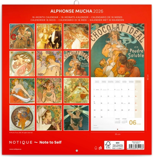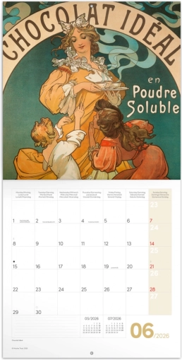 Ponesite kući djelić umjetnosti s ovim jedinstvenim zapisničkim kalendarom. Ukrašen je reprodukcijama najpoznatijih slika Alfonsa Muche, koji je proslavljen ponajprije svojim plakatima. Kalendar uključuje: