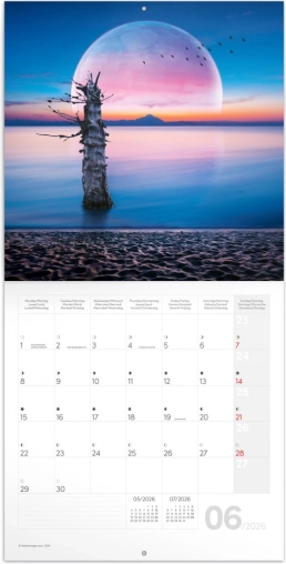 Kalendar sadrži pregledno kalendarij od rujna 2025. do prosinca 2026. s označenim blagdanima i mjesečevim mijenama.