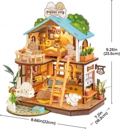 Otkrijte čaroliju stvaranja s kućicom koja sadrži prostranu spavaću sobu, ugodan dnevni prostor s ljuljačkom i blagovaonicom te na prvom katu balkon. Svaki detalj je precizno izrezbaren, uključuje mekanu posteljinu, noćni ormarić s lampom, prijenosno računalo, knjižnicu, aparat za cappuccino i cvijeće. Zahvaljujući LED rasvjeti u prizemlju i na prvom katu, vaš će se ljubimac osjećati ugodno.