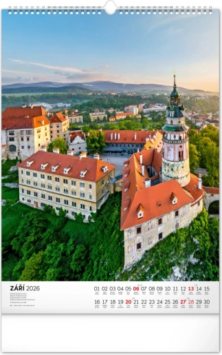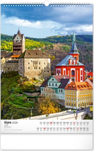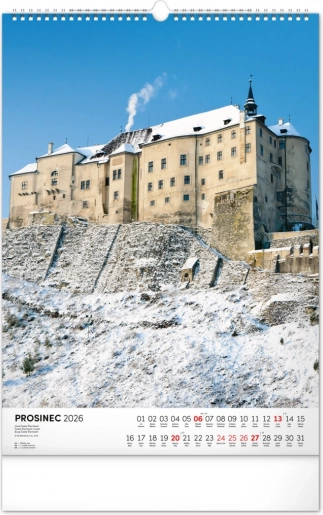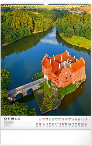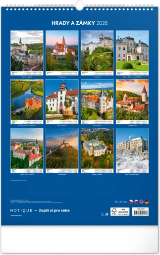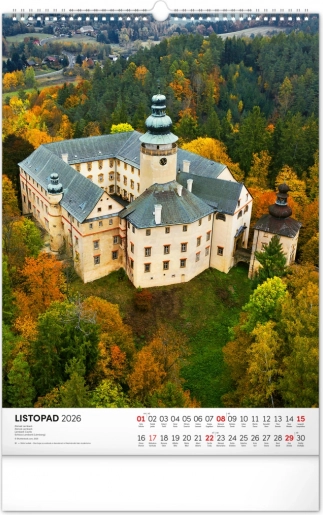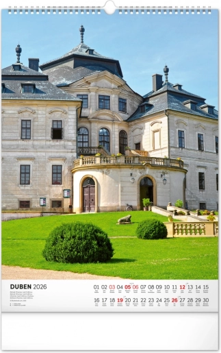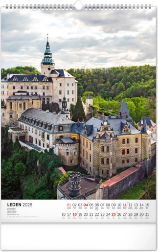 Zidni kalendar Dvorci i palače 2026 s češkim blagdanima. Fotografije Loket, Lednice, Hluboka. Veličina 33x46 cm.