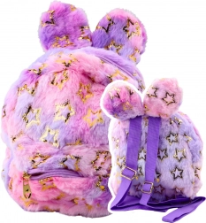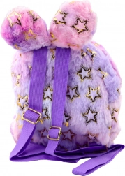 Ruksak je izrađen od mekog pliša u koji su utkane sjajne, zlatne zvjezdice. Uške koje vire na vrhu dodaju bajkoviti šarm, a cijela kombinacija pastelnih boja prijateljska je za djecu. Ruksak ima jedan glavni pretinac na patentni zatvarač i prednji manji džep, idealan za sitnice.