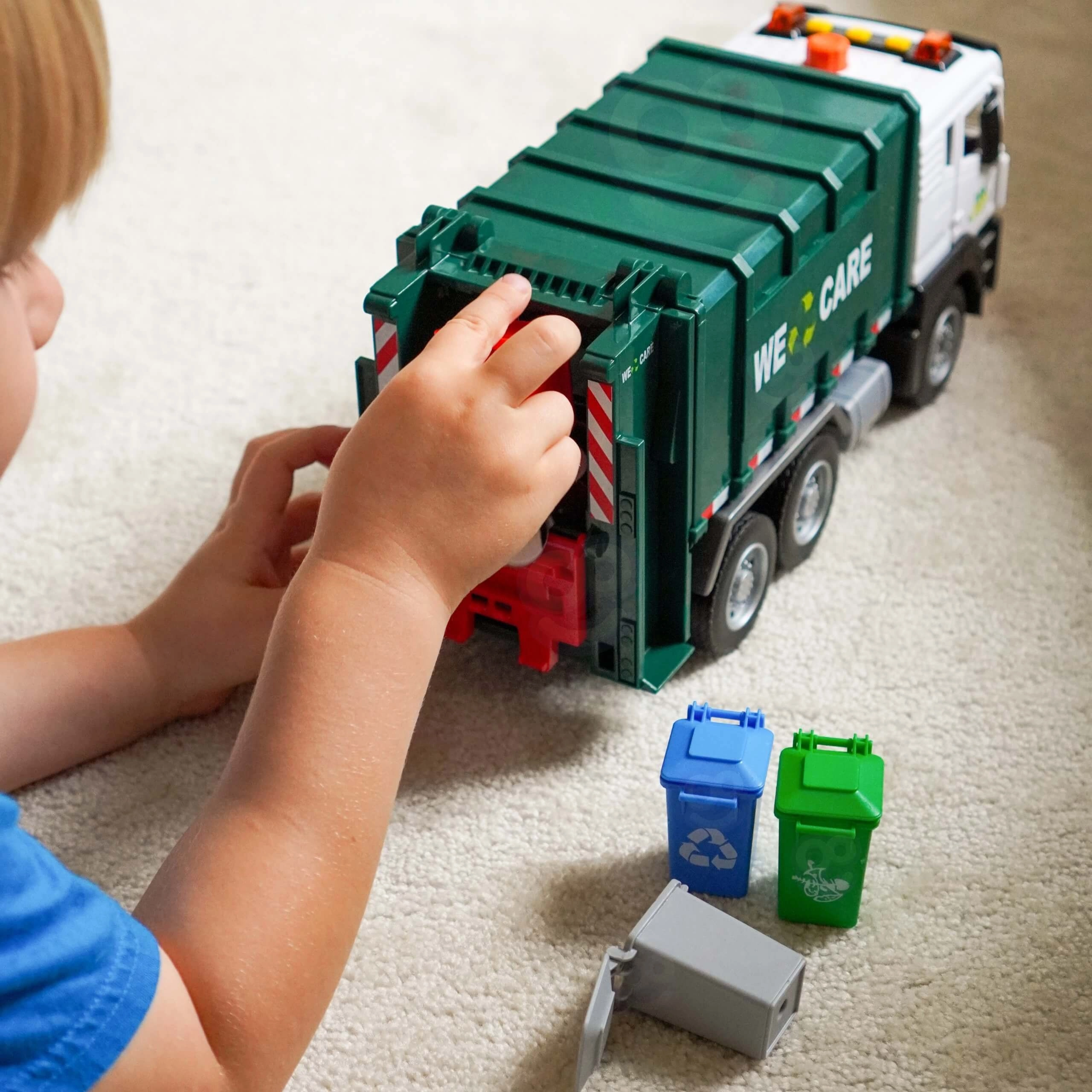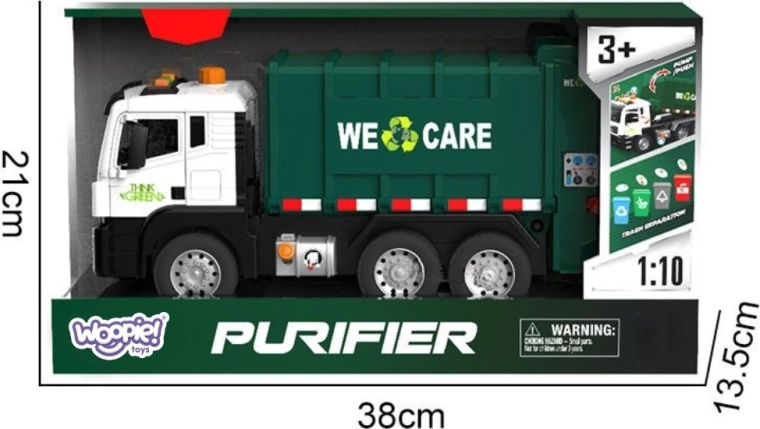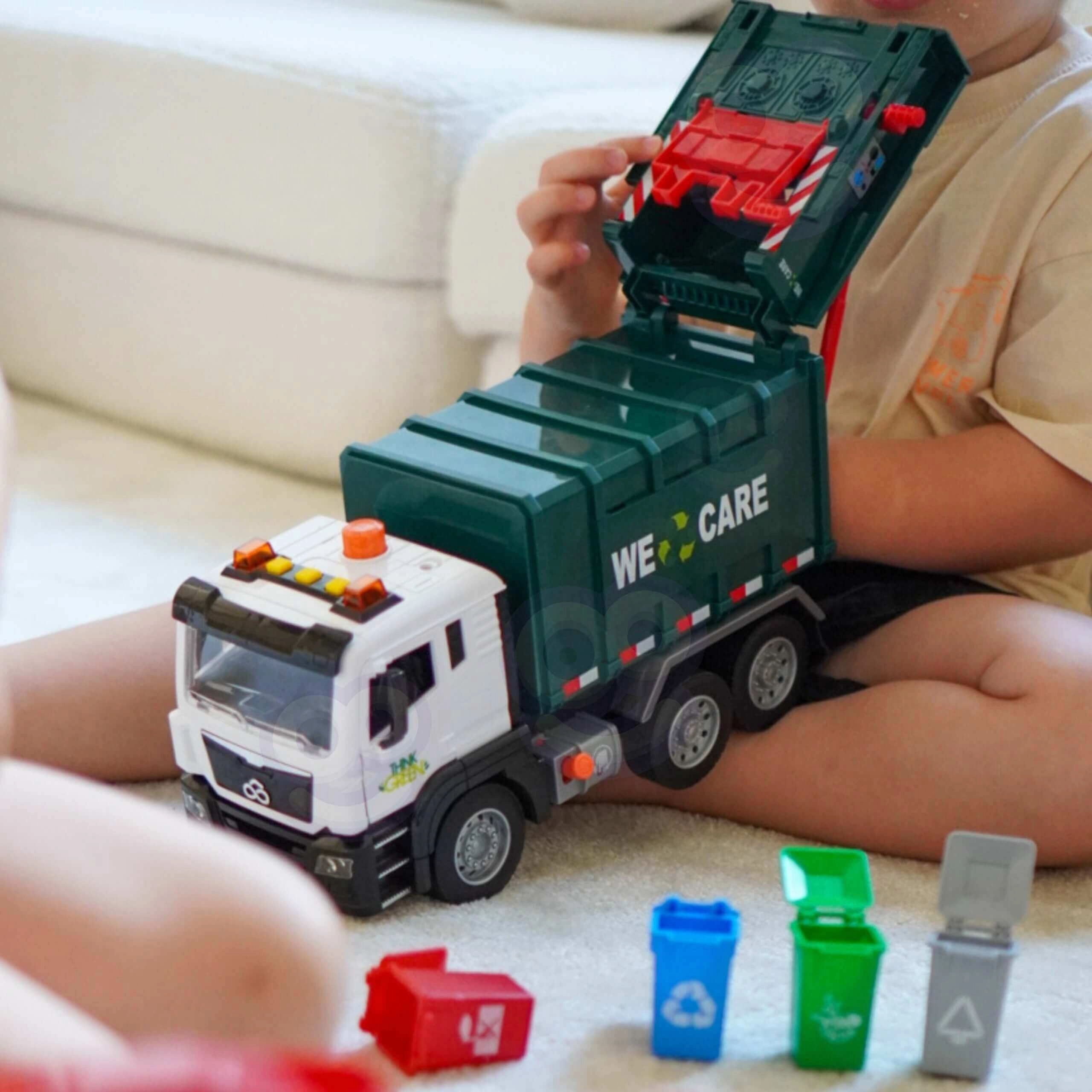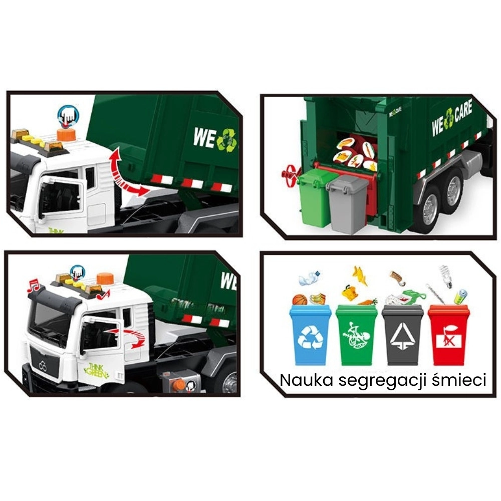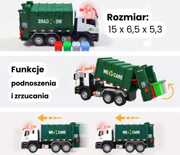 Ovaj detaljno izrađen kamion za smeće s natpisom „WE CARE” nudi djeci autentičnu igru odvoza otpada. Zahvaljujući funkcionalnoj podiznoj ruci, otvarajućim stražnjim vratima i priloženim mini kantama, djeca mogu isprobati stvarne postupke razvrstavanja i odvoza otpada. Integrirani svjetlosni i zvučni efekti povećavaju zabavu i potiču maštu.
