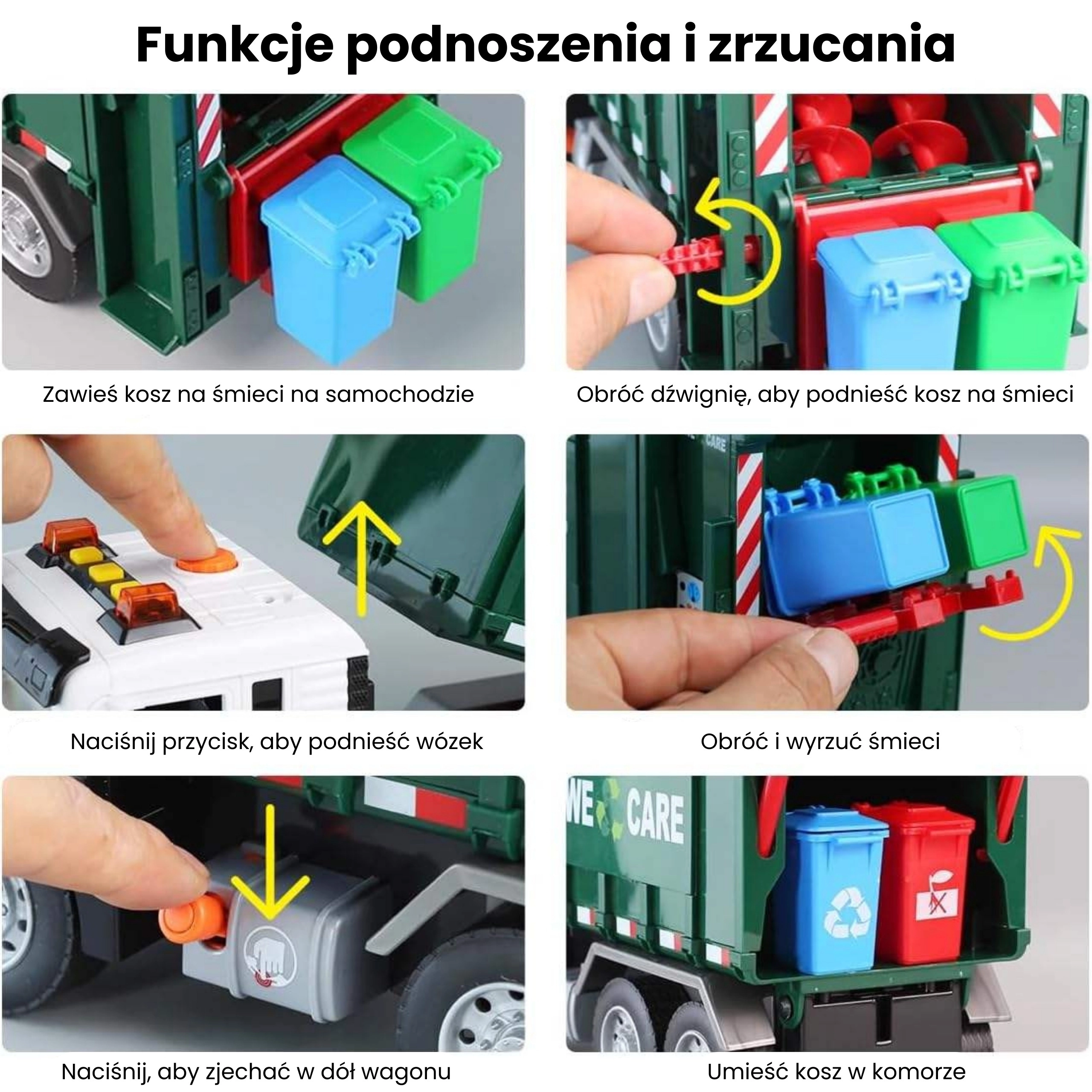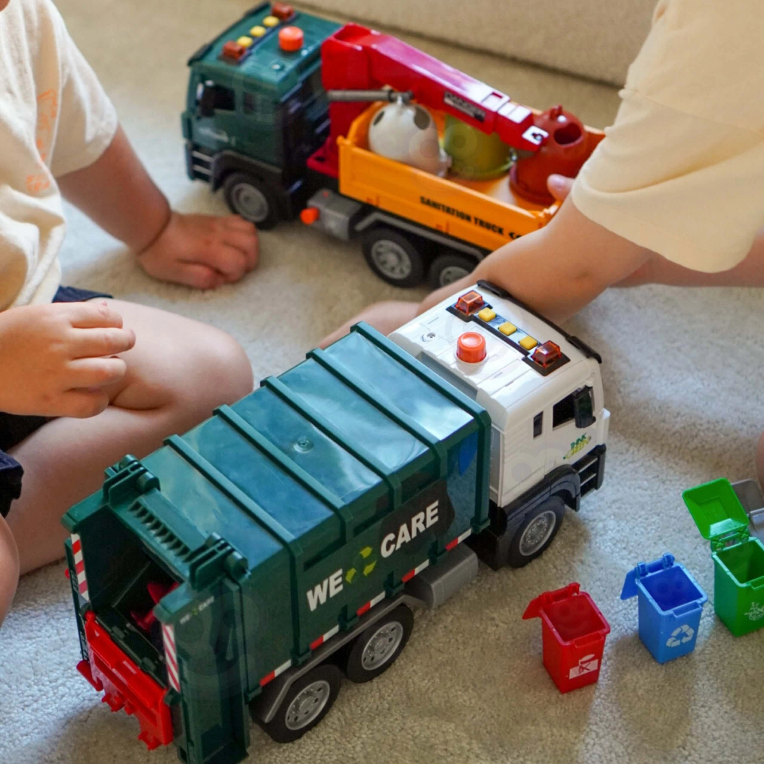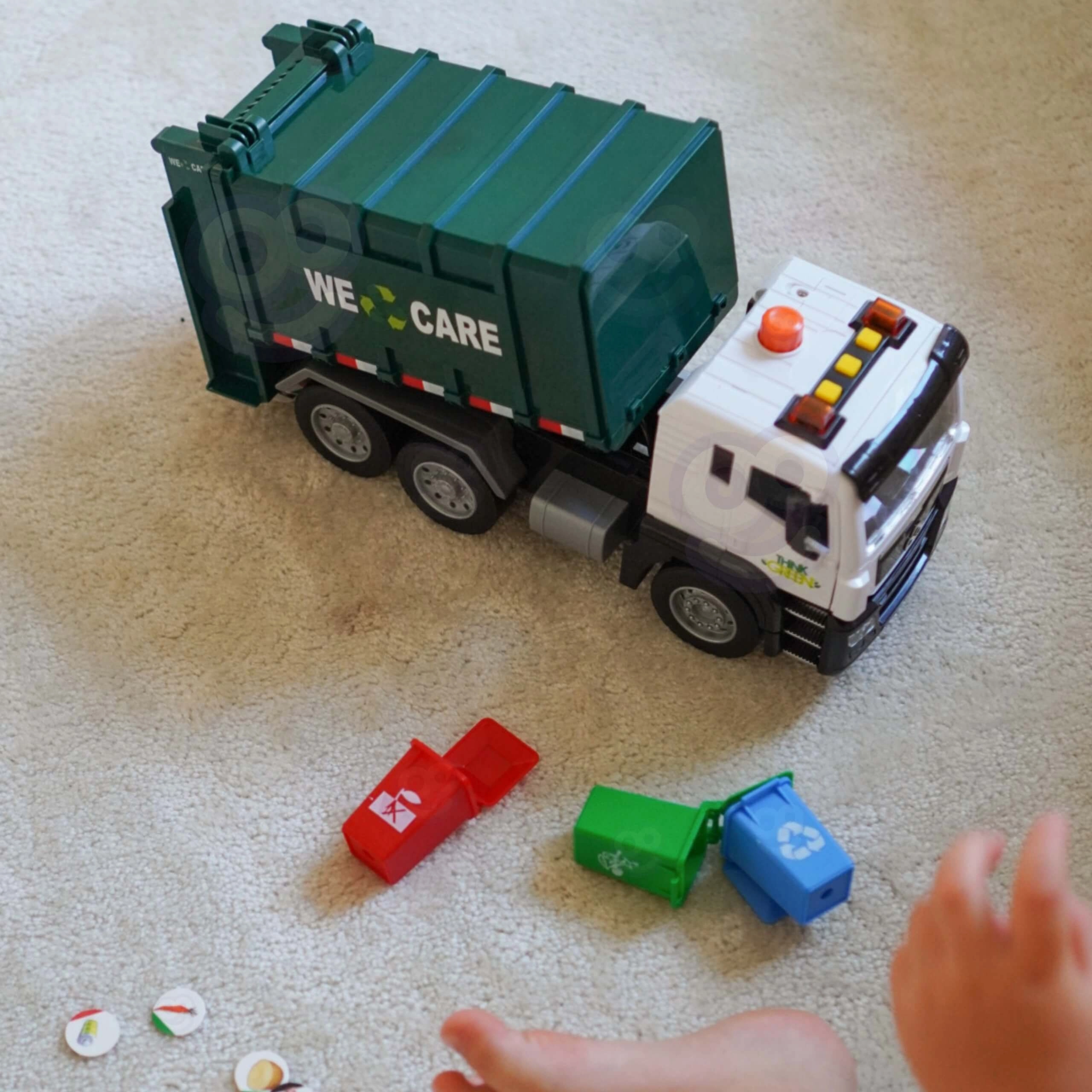 Ovaj detaljno izrađen kamion za smeće s natpisom „WE CARE” nudi djeci autentičnu igru odvoza otpada. Zahvaljujući funkcionalnoj podiznoj ruci, otvarajućim stražnjim vratima i priloženim mini kantama, djeca mogu isprobati stvarne postupke razvrstavanja i odvoza otpada. Integrirani svjetlosni i zvučni efekti povećavaju zabavu i potiču maštu.