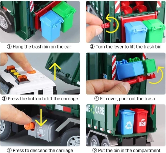 Podignite malu kantu, istresite sadržaj u sanduk, a zatim otvorite stražnja vrata za pražnjenje. Realistična mehanika uči djecu principima odvoza otpada.