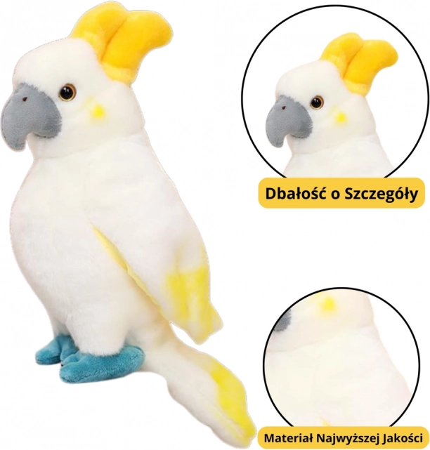 Plišani kakadu je prekrasno izrađena igračka u obliku egzotične ptice koja spaja estetsku, edukativnu i osjetilnu vrijednost. Njezin jedinstveni izgled – bijelo perje, karakteristični žuti krijest, sivi kljun i plave noge – čini je izvrsnim izborom kao mazilica ili kao dekoracija u dječjoj sobi.
