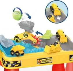 Dio seta su 4 mini građevinska autića (bager, miješalica, kiperi, buldožer), okretna dizalica, spust za vozila, vodene rampe i kolo te praktični dodaci za pijesak i vodu (zalijevača, lopatica, grablje, kalupi). Jednostavna konstrukcija omogućuje brzu montažu bez alata i lako čišćenje nakon igre.