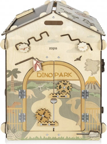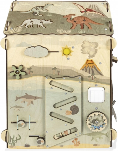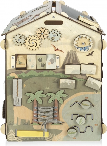 Krov služi kao crna ploča za krede, 3D dinosaurovske puzzle podržavaju prostornu predodžbu, a rotirajuće pločice s otiscima potiču pažnju i logiku. Praktični elementi poput patentnih zatvarača, vezica, zupčanika i labirinata pomažu razvijati samostalnost.