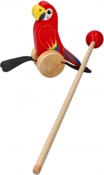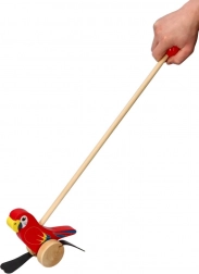Preslatka drvena papiga na štapu idealan je suputnik za prve korake djece od 18 mjeseci. Pri guranje kotači se glatko kotrljaju, a krilca se miču, što potiče prirodno kretanje i razigranu motivaciju za hodanje. Igračka je od izdržljivog drva, ima udoban štap duljine 47 cm i kompaktne dimenzije 15,5 × 10,5 × 6,5 cm. Udovoljava standardu CE i nudi stabilnu vožnju, šareni dizajn i sigurnu izradu.
