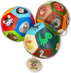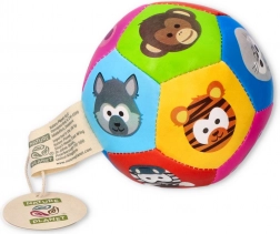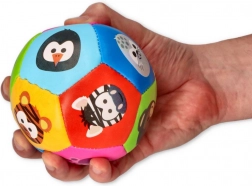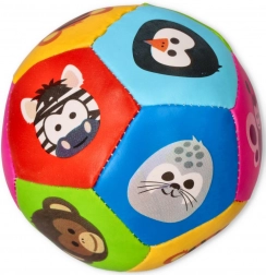 Ova šarena mekana loptica sa životinjama idealna je prva igračka za mališane. Raznobojni paneli s veselim motivima (zebra, tigar, pingvin, majmun i drugi) potiču istraživanje i privlače vizualnu pažnju. Zahvaljujući mekoj tekstilnoj površini i laganoj ispuni, loptica je sigurna za bacanje, hvatanje i kotrljanje u interijeru.