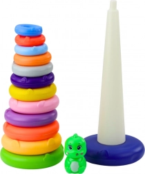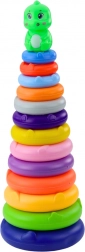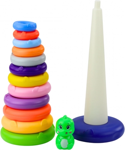 Ova se igračka sastoji od čvrste i stabilne baze, visokog klina i 13 šarenih prstenova različitih veličina. Svi elementi izrađeni su od lagane i izdržljive plastike, sigurne za malu djecu. Najviši dio kule krasi figurica simpatičnog dinosaura koja privlači dječju pažnju i potiče na daljnju igru.