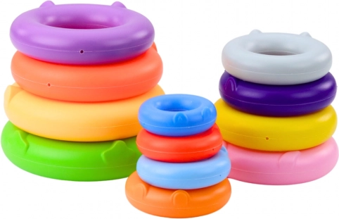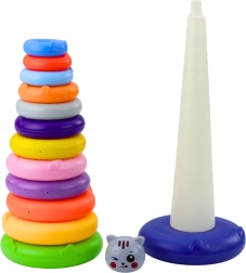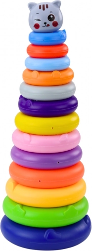 Ova igračka sastoji se od široke, stabilne baze, visokog klina i 13 šarenih prstenova koje dijete slaže samostalno, stvarajući impresivnu kulu. Na vrhu se nalazi figurica slatke mačke koja dodatno potiče dijete na igru i stvara atraktivan vizualni element.