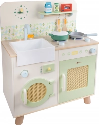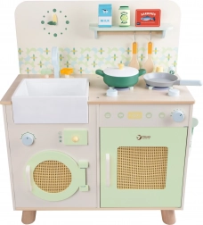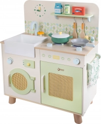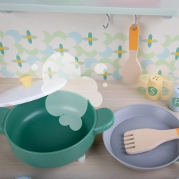 Ova drvena kuhinja namijenjena je djeci od 3 godine i nudi odlične estetske detalje u pastelnim bojama. Razvija maštu, motoriku i socijalne vještine djece. Izrađena je visokom kvalitetom i s pažnjom na svaki detalj. U pakiranju se nalaze i kuhinjski dodaci koje djeca mogu koristiti za igru kuhanja i druge svakodnevne situacije.