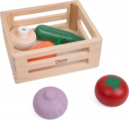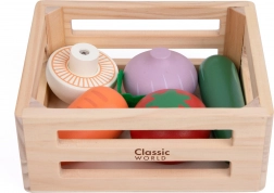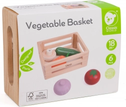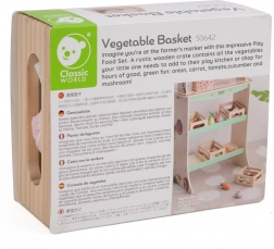 Drvena košara s povrćem brenda Classic World pruža djeci beskrajne mogućnosti kreativne igre u kuhinji ili trgovini. Drveni elementi koji predstavljaju različite vrste povrća poticanju mašte i društvenih vještina djece.