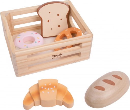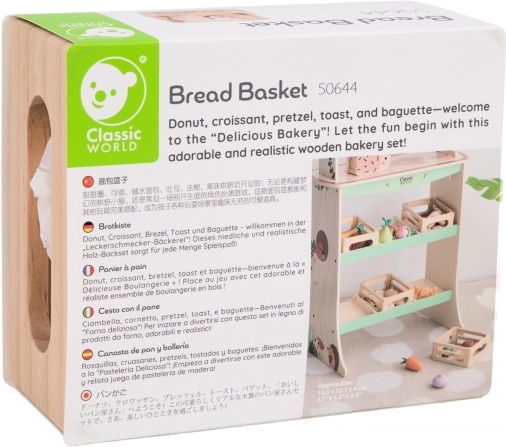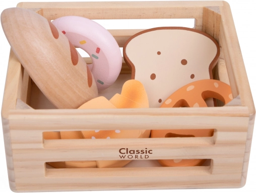 Otkrijte drveni pekarski košar brenda Classic World, idealan za male ljubitelje kreativne igre u kuhinji, trgovini ili pekarnici. Visokokvalitetni drveni elementi koji oponašaju različite vrste peciva potiču maštu i socijalne vještine djece.