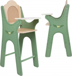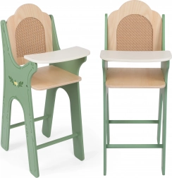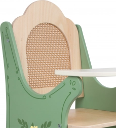 Drvena stoličica za lutke u vintage stilu s naslonom od ratana! Elegantna stoličica dodaje autentičnost igri brige o lutkama. U zelenim tonovima i s nježnim cvjetnim detaljima, ovaj je proizvod savršen dodatak svakoj dječjoj igri.