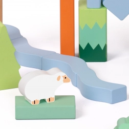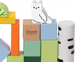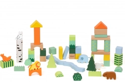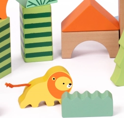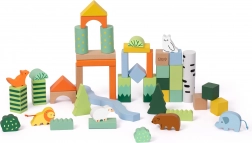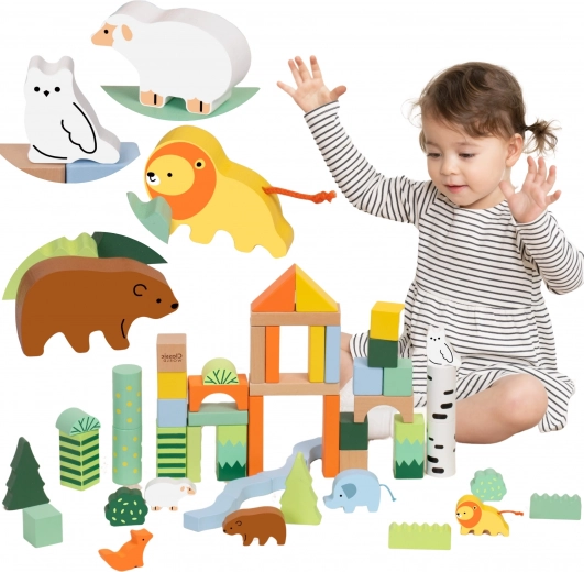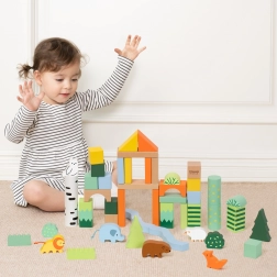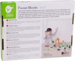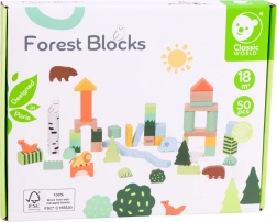 Ovaj set drvenih kocki sadrži 50 raznobojnih komada različitih oblika koji prikazuju stabla, životinje i šumske krajolike. Visoka kvaliteta izrade osigurava dugotrajnu izdržljivost i sigurnu igru. Kocke su ekološke i ne sadrže štetne tvari.