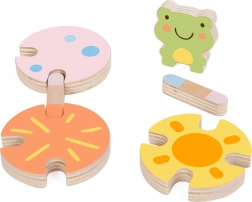 Šarena drvena žabica i nježni pastelni tonovi daju igri estetsku vrijednost i potiču prepoznavanje boja.