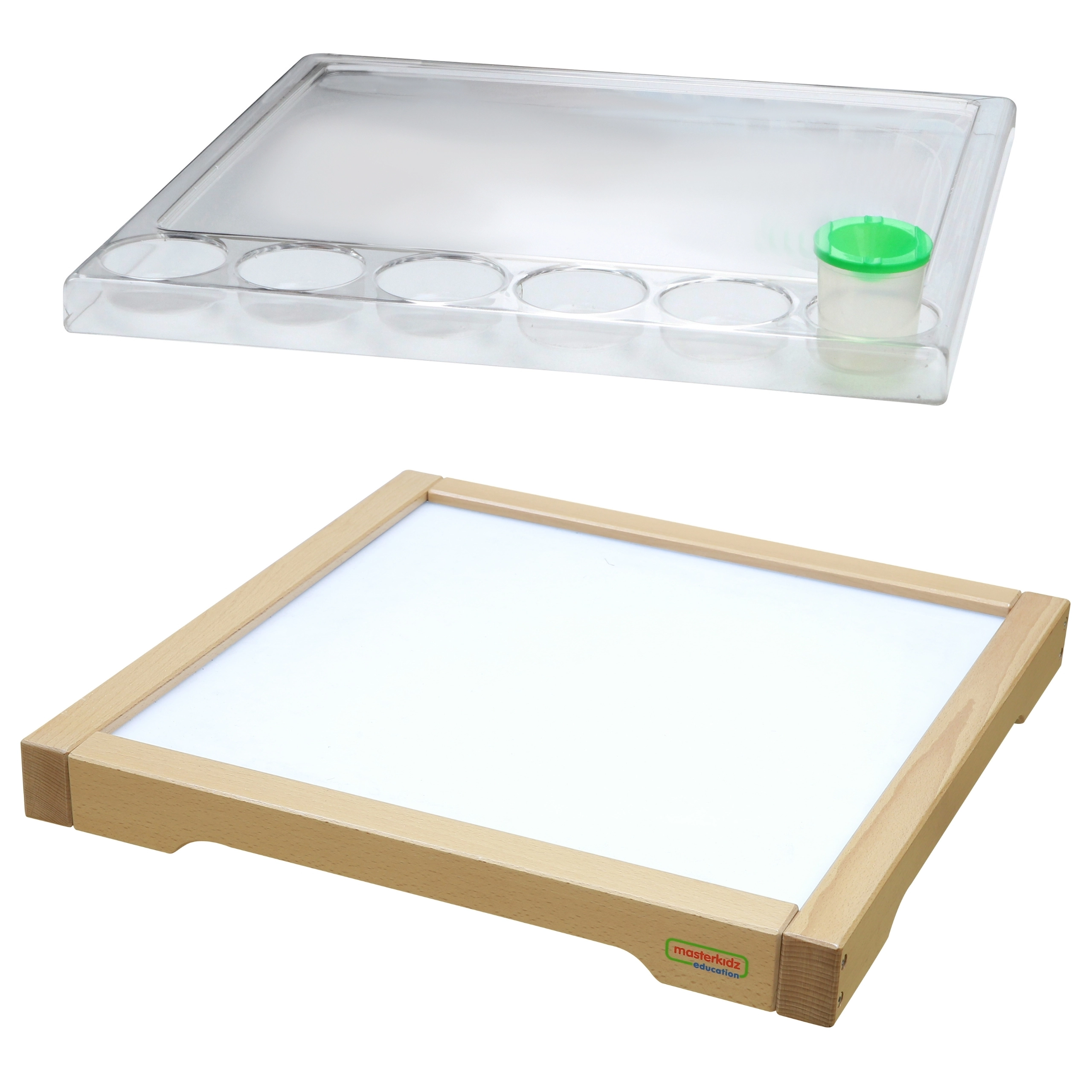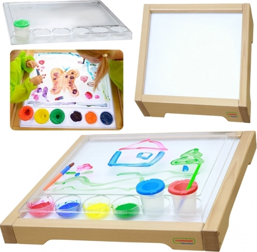 Drveni senzorički okvir Masterkidz s LED panelom osmišljen je za razvoj kreativnosti i potporu učenju putem STEM sustava. Osvijetljena LED svjetla omogućuju fascinantne svjetlosne efekte kroz različite materijale poput lišća, papira ili pijeska. Dio seta je i prozirna plitica za crtanje, koja dodatno ističe dječja umjetnička djela.