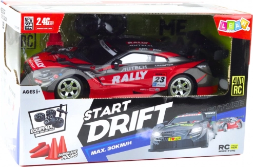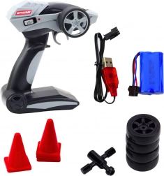 LED rasvjeta, uključujući prednja, stražnja i podvozna svjetla, daje autentičnost i stil. Daljinsko upravljanje na frekvenciji 2,4 GHz osigurava domet do 25 metara uz trenutačnu reakciju. Dodatni set guma i čunjića za drift omogućuje vam kreiranje vlastite trkaće staze.