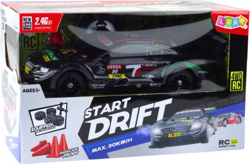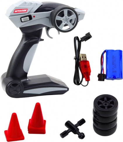 RC trkaći auto opremljen je LED svjetlima – prednjim, stražnjim i neonskim osvjetljenjem podvozja, što mu daje moderan i futuristički izgled. Zahvaljujući 2,4 GHz upravljanju pruža preciznu kontrolu do 25 metara. Prisutnost tipke turbo omogućuje brzo ubrzanje. Pakiranje sadrži i rezervne gume, čunjeve i ključ za njihovu zamjenu, što omogućuje stvaranje vlastitih trkaćih staza i vježbanje manevara.