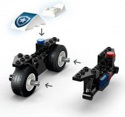 Razveselite male heroje od 4 godine akcijskim setom LEGO City Policijska akcija na motociklu. Sadrži policijski motor sa širokim gumama, mini bankomat s novčanicom, skateboard lopova i 2 minifigure za sate kreativne igre i pripovijedanja.