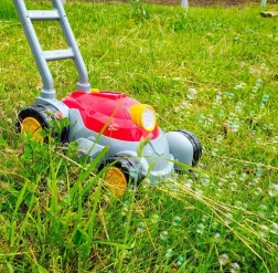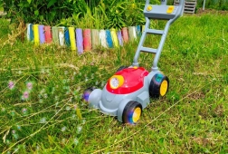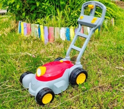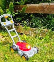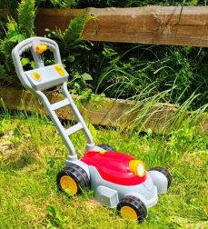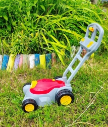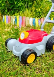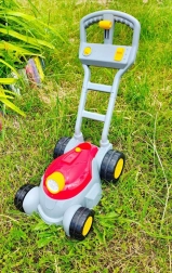Čvrsta plastična ručka i veliki kotači olakšavaju guranje po dvorištu. Laka konstrukcija idealna je za male ruke.