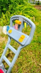Lagana konstrukcija, robustna ručka i veliki kotači osiguravaju lako guranje po travi i tvrdim podlogama. Igračka potiče kretanje, maštu i igru uloga, pa je idealna za zabavu na otvorenom u vrtu, na terasi ili u parku.